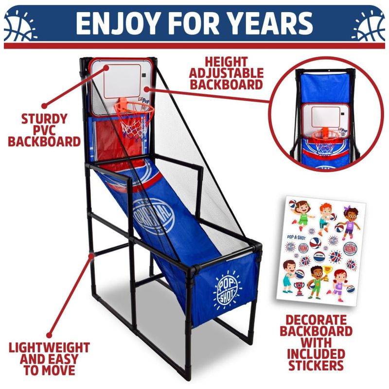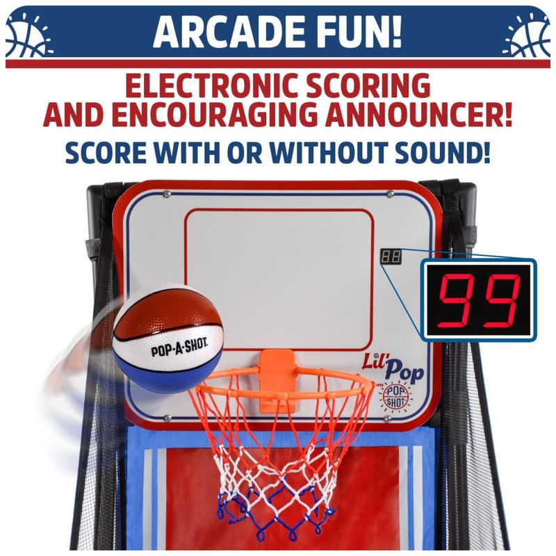 Pop-A-Shot, os criadores da experiência original de basquete arcade, apresentam com entusiasmo o Pop-A-Shot Lil' Pop! Perfeito para jogadores de 3 a 6 anos, o Lil' Pop foi projetado pensando nos pequenos astros do basquete, trazendo uma experiência divertida e educativa. Este jogo ajuda as crianças a desenvolverem coordenação motora grossa, habilidades motoras finas e a aprenderem a melhorar suas pontuações, enquanto se divertem com um clássico do basquete arcade.