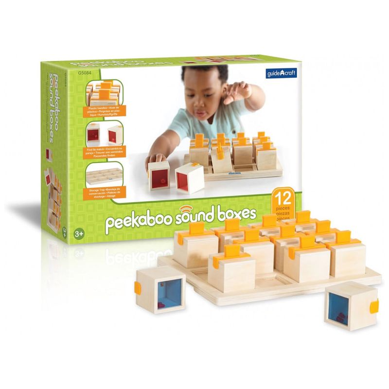 O jogo de caixas sonoras Guidecraft é um recurso educativo desenvolvido para estimular a percepção auditiva e o pareamento de sons em crianças a partir de 3 anos. O conjunto inclui 12 cubos com sons internos e uma bandeja de madeira que organiza as peças, facilitando o uso em casa, escolas e espaços pedagógicos.