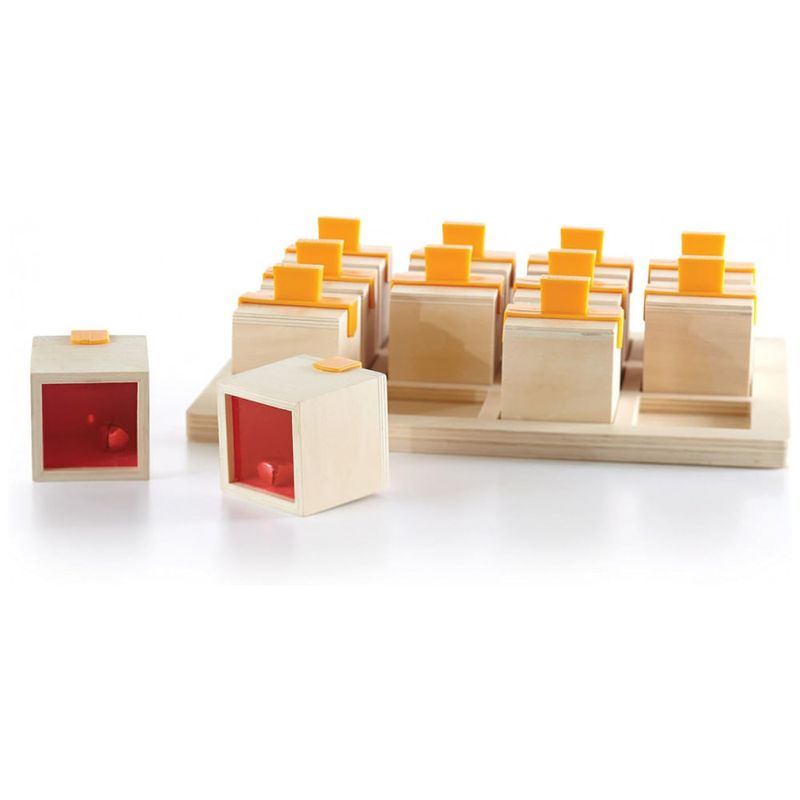 Cada caixa sonora possui janelas em acrílico translúcido e alças plásticas macias, permitindo que a criança visualize parcialmente o interior e manuseie os cubos com segurança. Ao agitar cada cubo, a criança escuta um de seis sons distintos e precisa encontrar o par correspondente, reforçando habilidades de atenção, memória e discriminação auditiva.