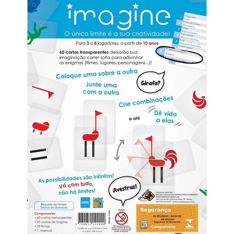 Em Imagine os jogadores terão a tarefa de se comunicar sem usar palavras, a fim de solucionar as cartas de enigmas que serão utilizadas a cada rodada. Usando apenas cartas transparentes, muita imaginação e criatividade, os jogadores devem criar, animar, sobrepor e dar vida às cartas para fazer com que os outros jogadores descubram o que está por trás do enigma com uma dica simples como Animal ou Expressão.