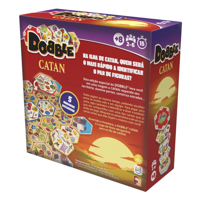 Esta edição especial do Dobble leva você em uma viagem a Catan. Todos jogam ao mesmo tempo, podendo escolher entre os modos solo e em equipe. Para jogar uma carta, seja o primeiro a identificar e dizer o símbolo que ela compartilha com uma das cartas que já estão em jogo. Bloqueie os adversários antes que eles o façam!