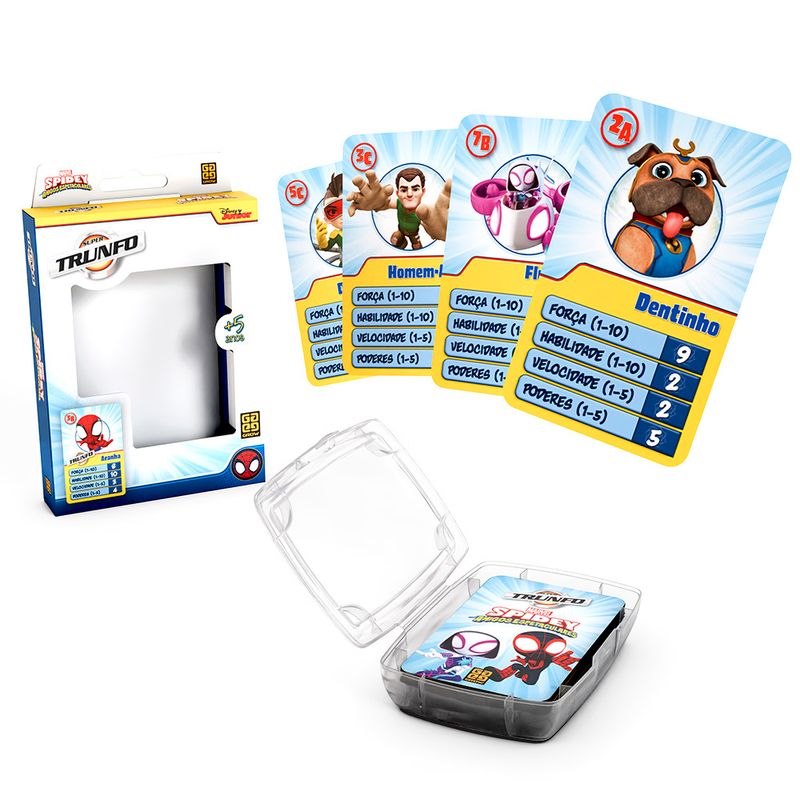 Super Trunfo Spidey traz 32 cartas com ilustrações e informações sobre os personagens da série Spidey. Em qual item seu personagem é melhor? Será na habilidade? Na força? Ou você possui o Super Trunfo? Escolha, compare e vença esta emocionante disputa, revelando o herói mais poderoso!