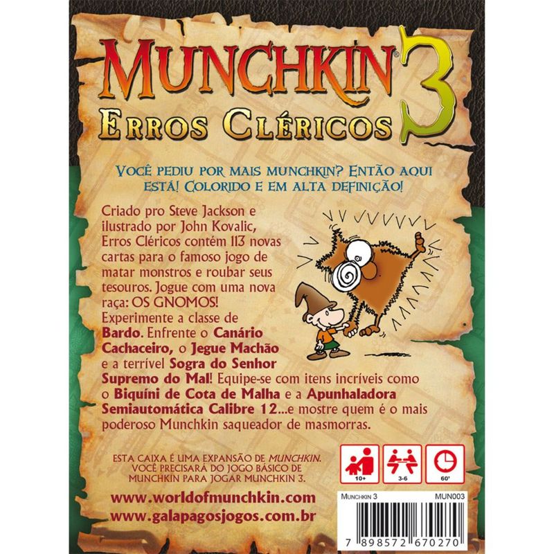As expansões de Munchkin adicionam ao jogo base novas raças, classes, tesouros e muitos, muitos, MUITOS monstros! Mais desafios para aqueles que são bravos e corajosos o bastante para entrar na Masmorra chutando portas.