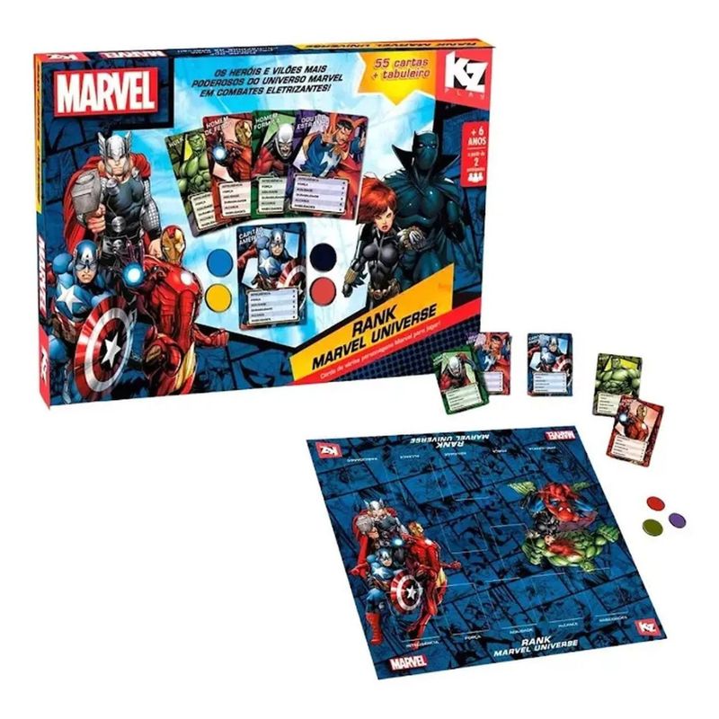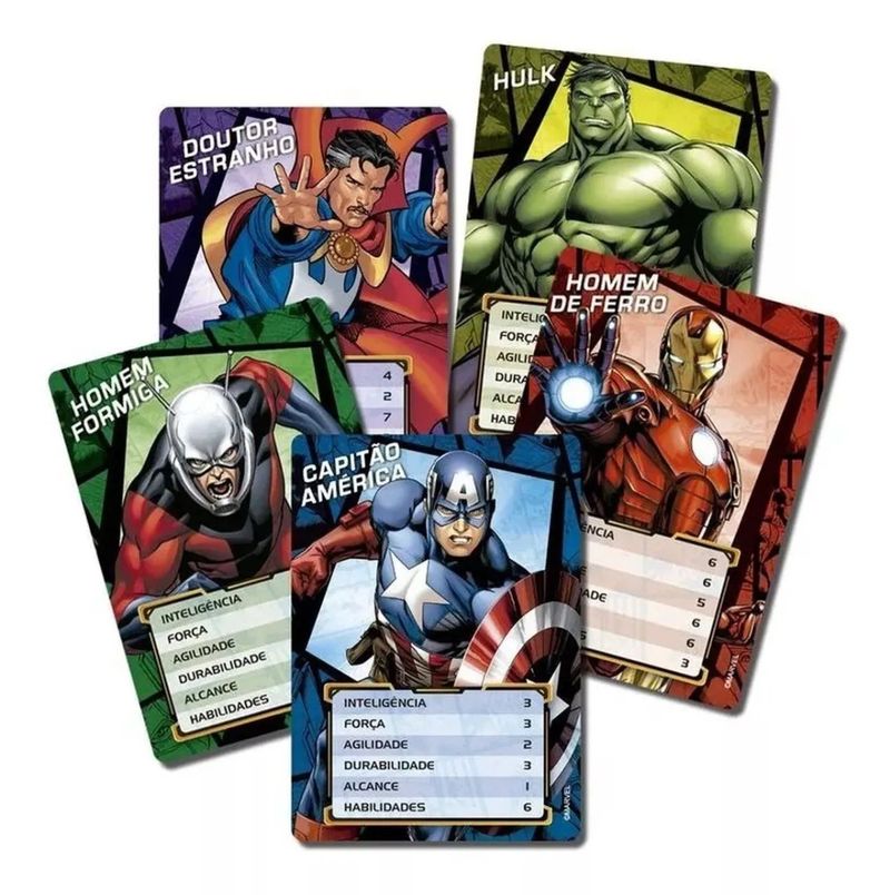 São 55 cartas com personagens de Marvel, moedas de efeito e tabuleiro. Cada carta contém uma lista de cinco atributos sobre os heróis e vilões mais poderosos do Universo Marvel para combates eletrizantes.