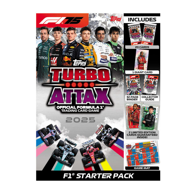 O Starter Pack contém 20 cards Turbo Attax, incluindo uma Edição Limitada Emerald do Andrea Kimi Antonelli e uma Edição Limitada Ruby do Lewis Hamilton. Também acompanha uma carta gigante Supernova do Lewis Hamilton, um fichário de colecionador com capas, um tapete de jogo e um guia do colecionador de 16 páginas.
