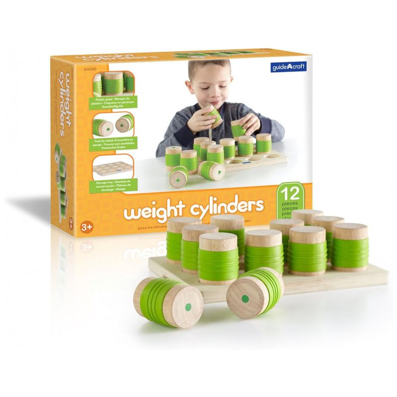 O jogo de cilindros de peso Guidecraft é um recurso sensorial desenvolvido para estimular a percepção de peso e o pareamento tátil em crianças a partir de 3 anos. O conjunto é composto por 12 cilindros de pesos distintos e uma bandeja de madeira que organiza as peças, indicado para uso em casa, escolas e ambientes de educação infantil.