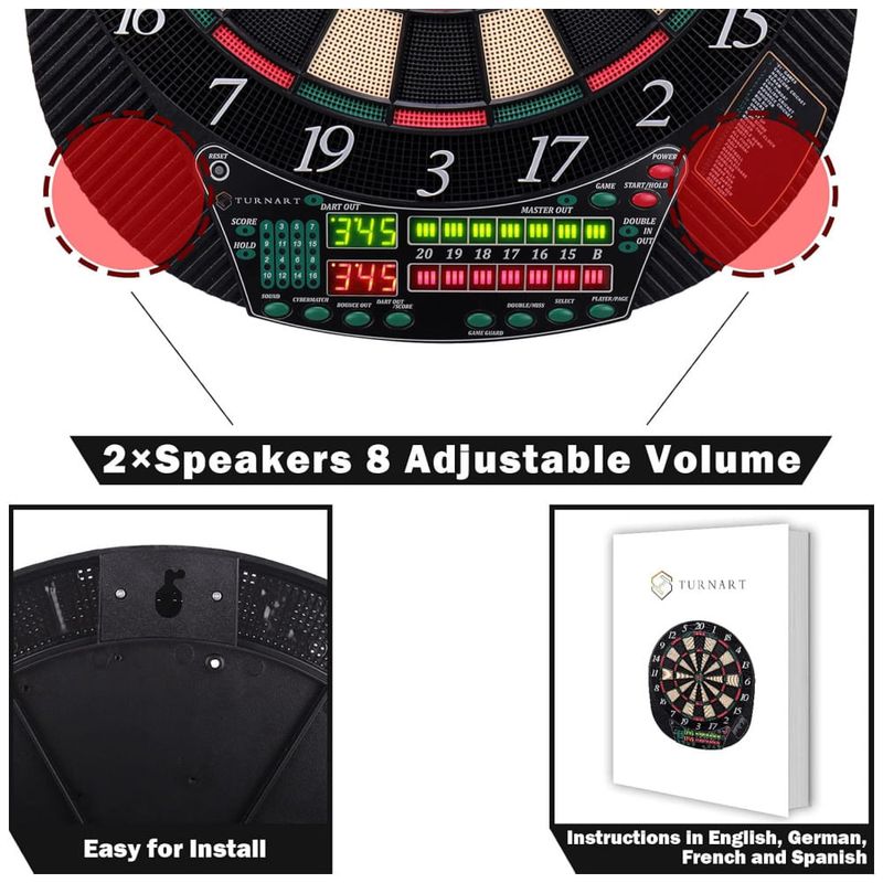 Este alvo de dardos eletrônico para adultos vem equipado com 2 indicadores LED automáticos e 2 indicadores LED de críquete, facilitando a visualização dos resultados. Com 2 alto-falantes que oferecem efeitos sonoros interativos e saída de voz, proporciona uma experiência imersiva durante o jogo. O volume ajustável, com 8 níveis disponíveis, permite adaptar o ruído de fundo conforme preferências pessoais.