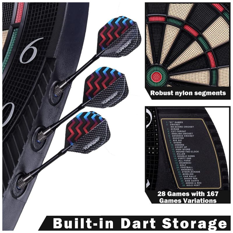 Os segmentos de dardo eletrônico de 34 cm oferecem uma experiência de jogo renovada, com uma seleção de 28 variações, incluindo clássicos como 301 e 501, diversas variações de críquete, além de contagem progressiva e mais opções emocionantes. Com capacidade para até 16 jogadores, este alvo é adequado para crianças, adultos e jogadores de todos os níveis, desde iniciantes até profissionais.