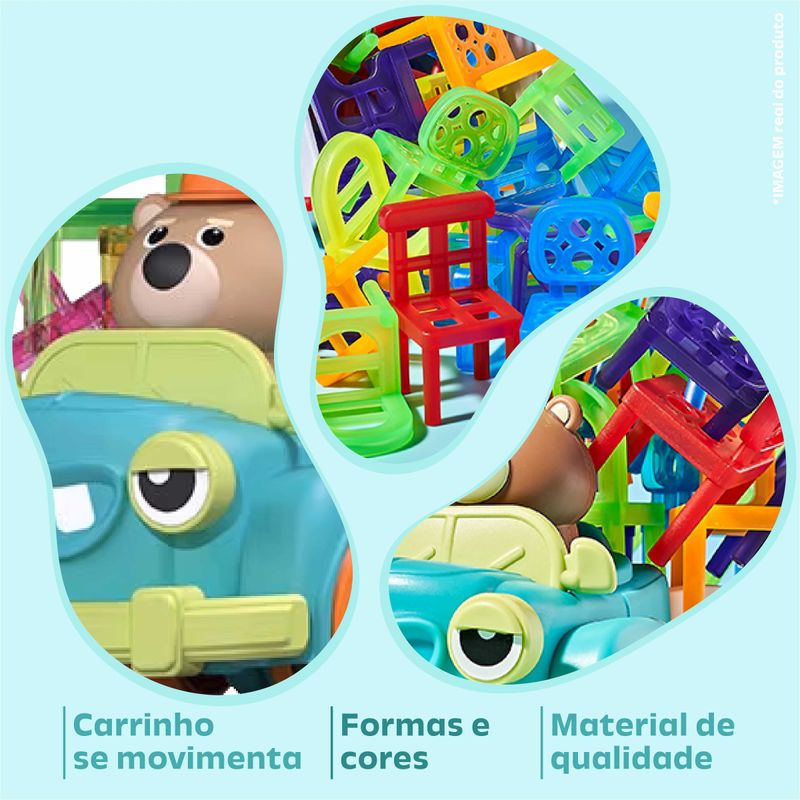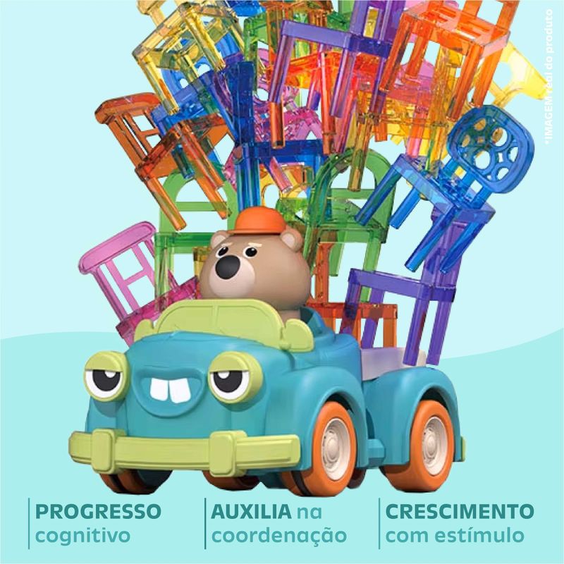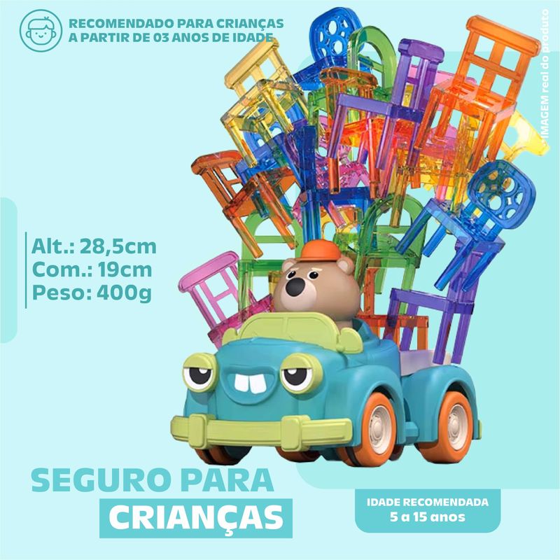O jogo de mesa com carrinho chegou para transformar a diversão em momentos inesquecíveis entre pais e filhos. Além de garantir risadas, esse brinquedo educativo ajuda no desenvolvimento das crianças com desafios que estimulam lógica, reflexos e coordenação motora. Com 48 cadeirinhas coloridas em seis modelos diferentes, as crianças podem empilhar de várias formas enquanto o carrinho se movimenta, trazendo ainda mais emoção para a brincadeira. O ursinho motorista deixa tudo mais fofo e envolvente, tornando a experiência completa para os pequenos exploradores. ESPECIFICAÇÕES TÉCNICAS: