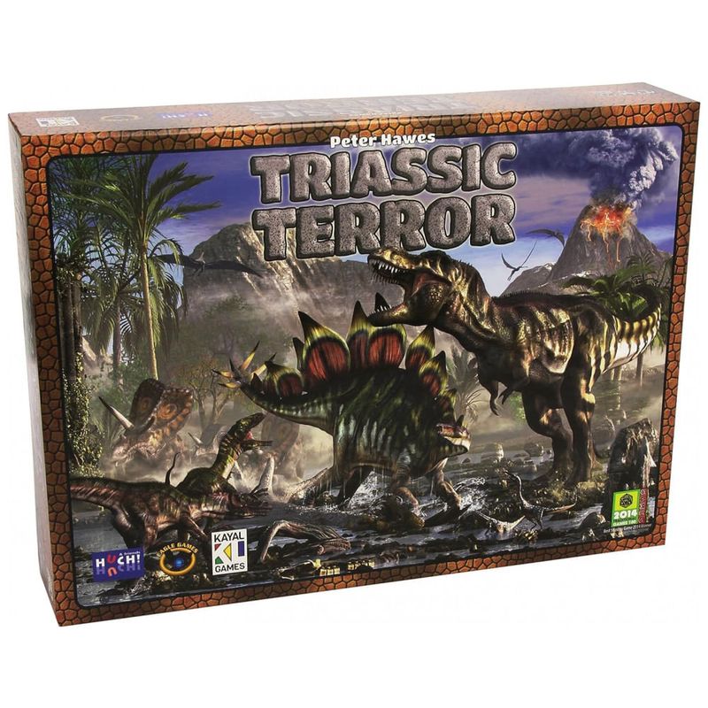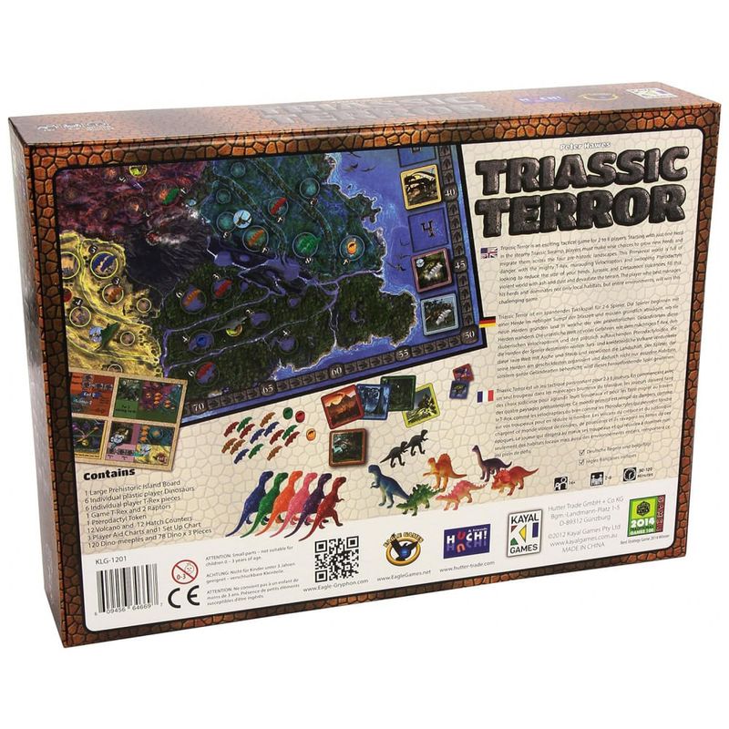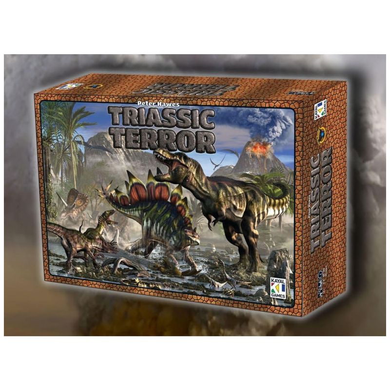 Triassic Terror é um emocionante jogo tático para 2 a 6 jogadores. Começando com apenas um rebanho no vaporoso Triássico Swamp, os jogadores devem fazer escolhas sábias para criar s rebanhos e guiar sua migração pelas quatro paisagens pré históricas. Este mundo primitivo está cheio de perigos, com o poderoso T Rex, raptores saqueadores e pterodáctilos procurando reduzir o tamanho de seus rebanhos. Vulcões jurássicos enchem este mundo violento de cinzas e poeira e devastam o terreno. O jogador que melhor administrar seus rebanhos e dominar não apenas habitats locais, mas ambientes inteiros, vencerá este jogo desafiador