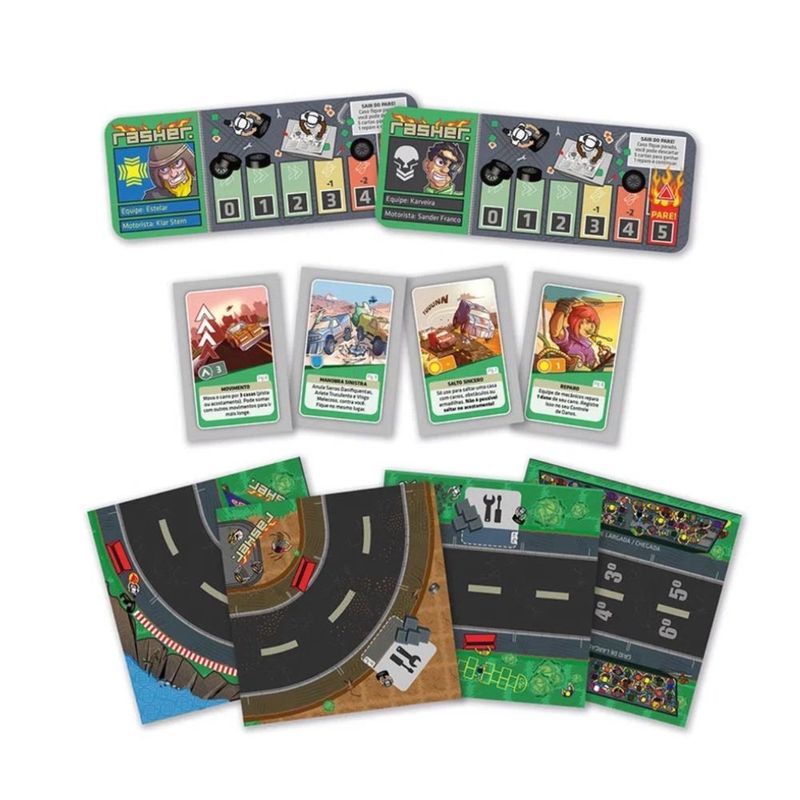 12 tiles de estrada (frente e verso), 6 carros de corrida, 91 cartas de ação, 6 cartas de pole position, 6 controles de danos, 6 marcadores de danos, 6 etiquetas de fogo, 1 manual de instruções Composição/material(is) Cartonado e plástico.