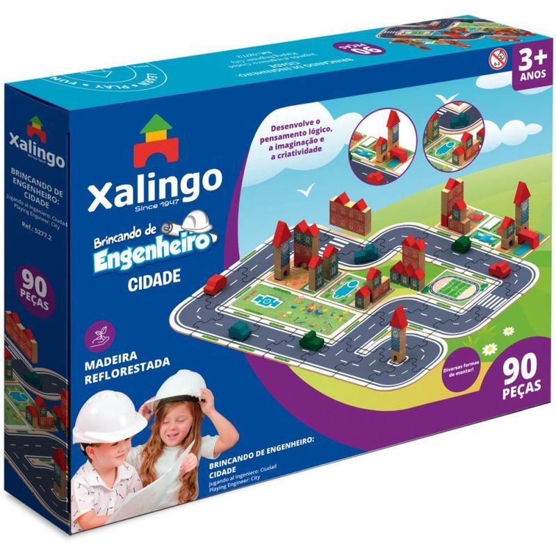 O Brinquedo de montar Brincando de Engenheiro Cidade, da Xalingo, sao blocos de madeira que possibilitam o desenvolvimento do pensamento logico, da imaginacao, da criatividade, das nocoes espaciais, das relacoes parte todo e da coordenacao motora. Contem 90 pecas e e recomendado para criancas a partir de 3 anos.
