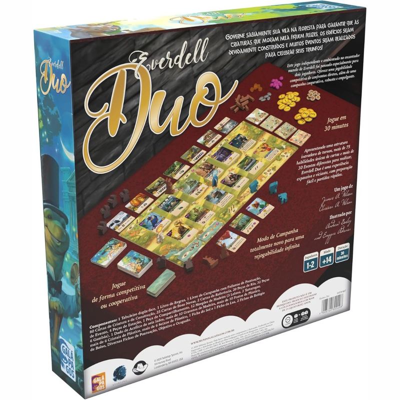 Governe sabiamente sua vila na floresta para garantir que as criaturas que moram nela fiquem felizes, os edifícios sejam devidamente construídos e muitos Eventos sejam realizados para celebrar seus triunfos! Este jogo independente e ambientado no encantador mundo de Everdell foi pensado especialmente para dois jogadores. Oferece uma jogabilidade competitiva de confrontos diretos, além de uma campanha cooperativa, robusta e empolgante. Apresentando uma estrutura inovadora de turnos, mais de 75 habilidades únicas de cartas e mais de 30 Eventos diferentes para realizar, Everdell Duo é uma experiência expansiva e viciante, com preparação fácil e partidas rápidas. Jogue de forma competitiva ou cooperativa Jogue em 30 minutos Modo de Campanha totalmente novo para uma rejogabilidade infinita