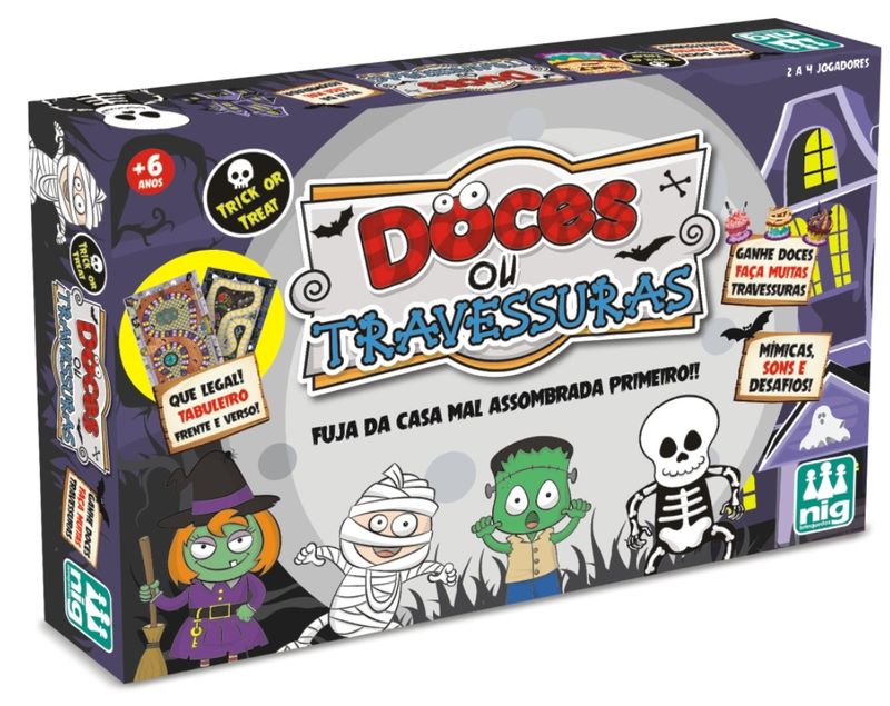 Um jogo super divertido da Nig no melhor estilo Halloween, este jogo vai desafiar as crianças a ganhar doces ou fazer travessuras percorrendo o tabuleiro que tem frente e verso. Para sair da casa mal assombrada cada jogador terá que cumprir desafios: Cantar Parabéns miando como um gato, fazer mímica de um fantasma, cócegas no vizinho e muitas outras.
