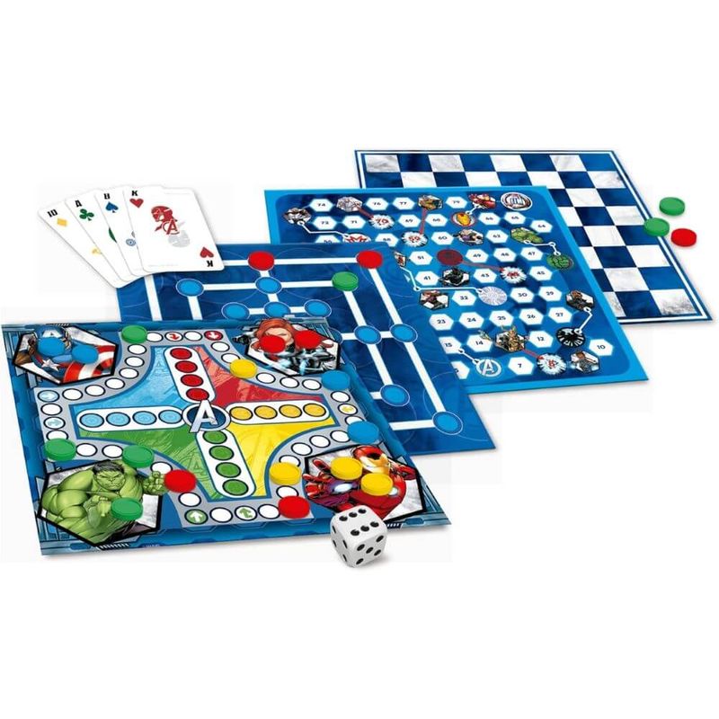 Aproveite este incrível kit de jogos clássicos dos heróis mais poderosos! São 4 jogos de tabuleiro com temática dos Vingadores (Dama, Ludo, Trilha e Sobe e Desce) e um baralho personalizado e exclusivo para você jogar com toda sua família ou amigos!