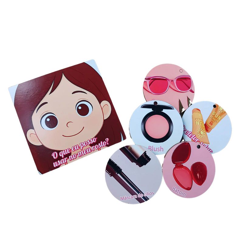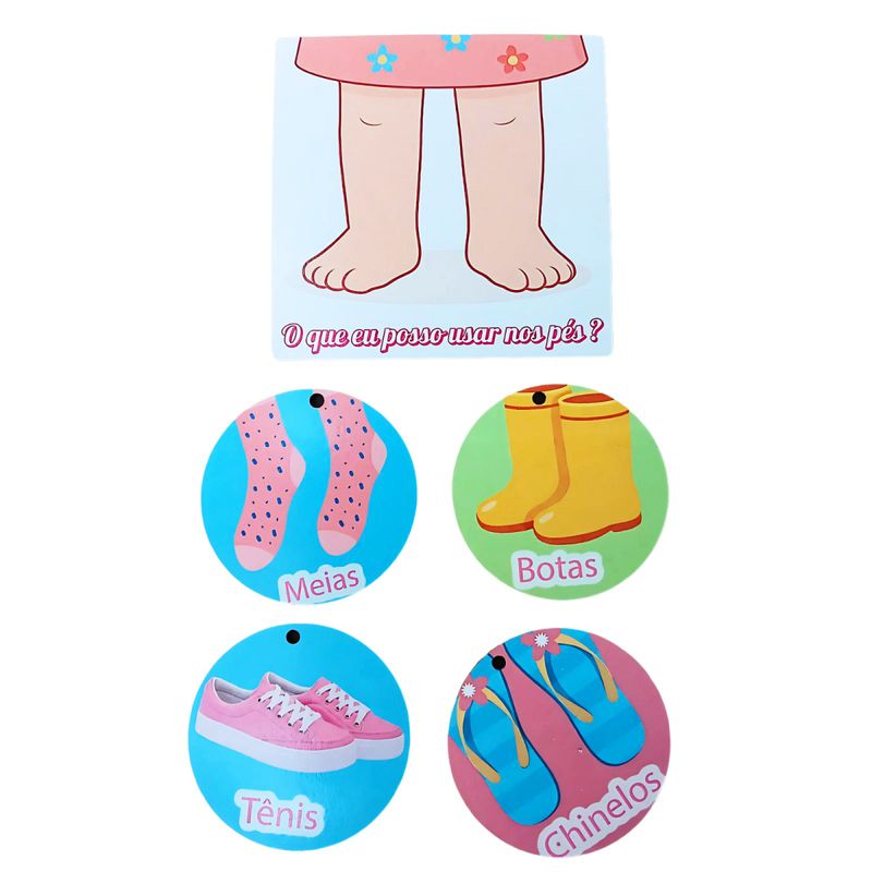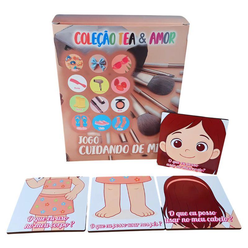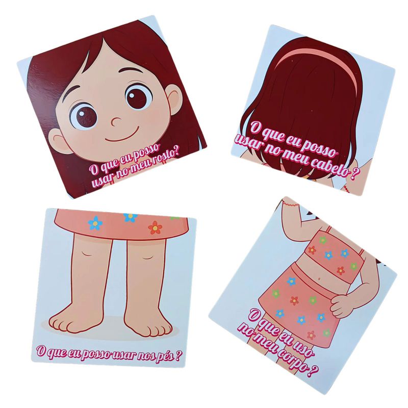 Composto por 4 placas ilustrativas – "O que eu uso no cabelo", "O que eu uso no rosto", "O que eu uso no corpo" e "O que eu uso nos pés" – o jogo convida a criança a explorar cada parte do corpo e os itens de cuidado associados. Ao brincar, a menina não apenas aprende os nomes e as funções dos objetos do cotidiano, mas também se conecta com sua rotina de autocuidado de maneira positiva, fortalecendo sua autonomia e construção de identidade.