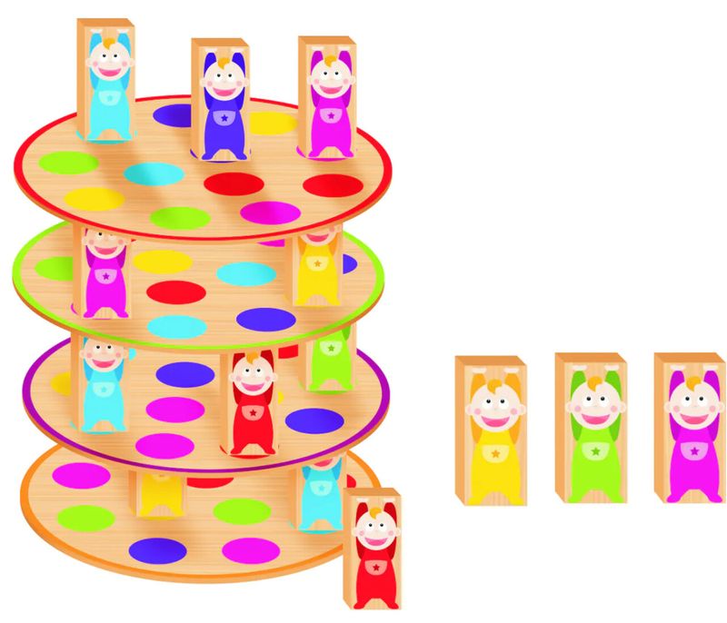 - Caixa de atividade para a criança montar a torre mais alta, equilibrando os “bebês” nas cores sorteadas.