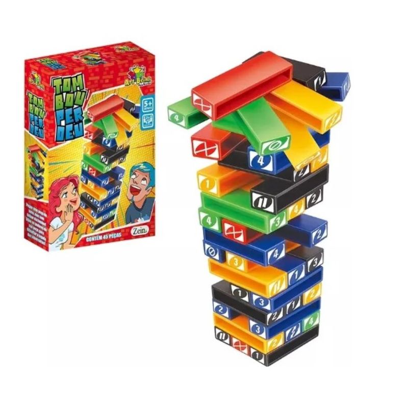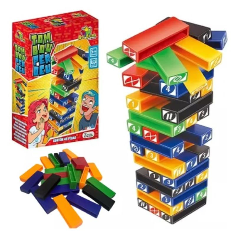 O jogo Tombou Perdeu é perfeito para interação com os seus familiares e amigos, para dar início ao jogo, uma torre com os blocos deverá ser montada, cada jogador retira um bloco de qualquer andar, vão empilhando por cima da torre de forma que ela crie novos andares e não perca o equilíbrio.