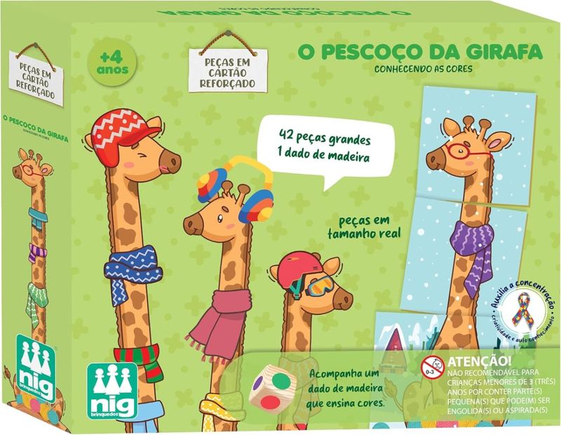 Jogue o dado, vire a peça com a cor sorteada e construa sua girafa. A peça da cabeça vai “trancar” o seu jogo!