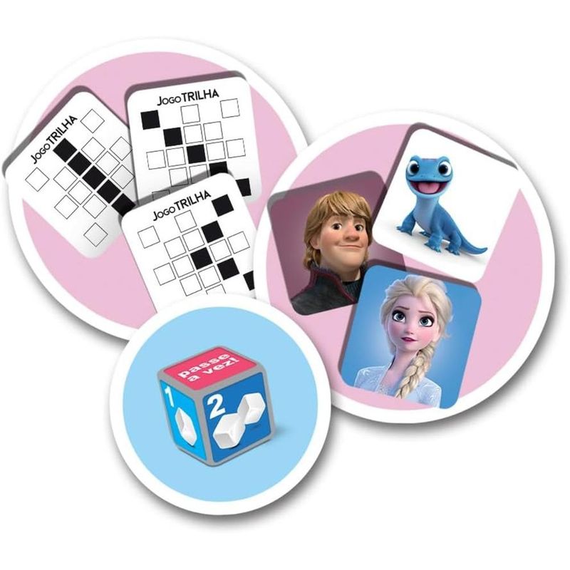 -Um jogo de sorte, estratégia e os personagens favoritos de Frozen. -O Objetivo do jogo é montar 5 imagens do seu personagem sorteado, na sequência que está na sua carta de trilha. -O dado especial indica os movimentos de cada jogador a cada lance, e tudo pode mudar! -Vence quem completar o desafio em 3 rodadas. Características: Marca - Elka Cód. 1232 Idade: + 5 anos Material: Plástico Para 2 Jogadores