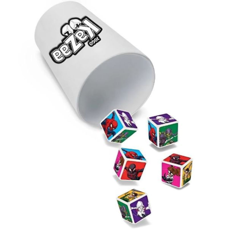 Jogo de dados, cartas e tabuleiro. O jogador retira uma carta e lançando os dados 3 vezes, deve cumprir o desafio proposto na carta. A cada vez que completa o desafio avança no tabuleiro. Estratégia e sorte para vencer. Vence quem primeiro cruzar a linha de chegada Seis dos mais famosos personagens de Spider-Man integram o conjunto de dados deste desafio incrível.