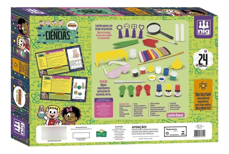 Contém: 02 tubos de ensaio, 01 lupa, 01 óculos de segurança, 01 pipeta, funil, corantes, guaches, massinha e muito mais!