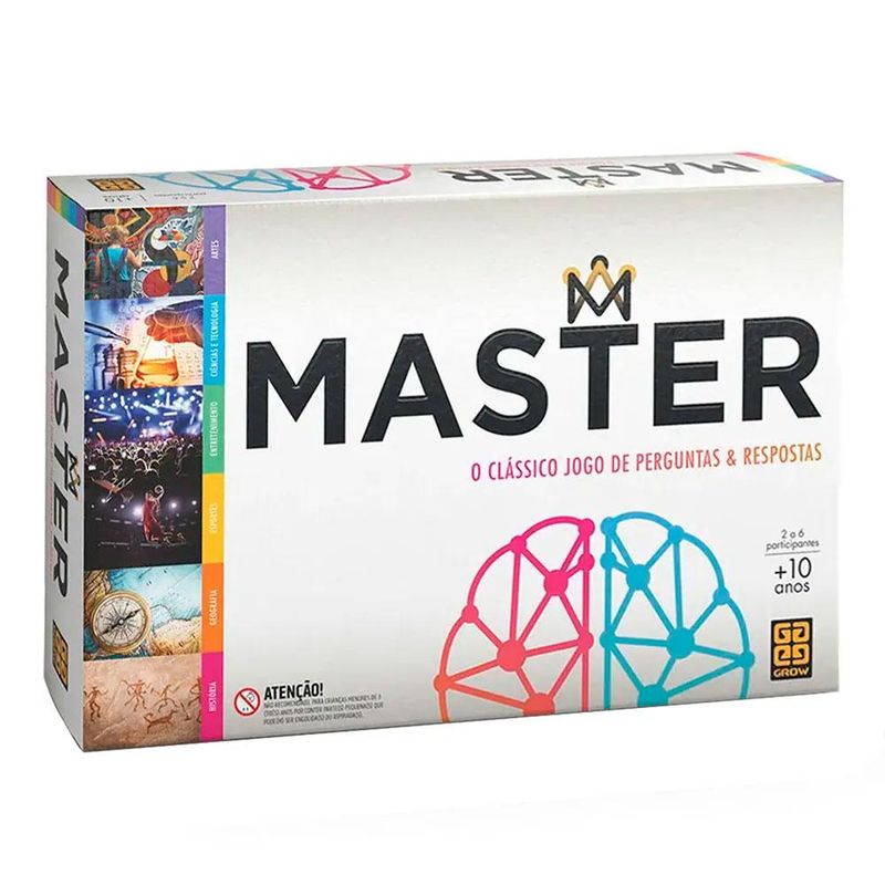 Jogo Master - Grow Chegou a hora de encarar o primeiro jogo de perguntas e respostas lançado no Brasil! Um clássico que está de volta. Reúna os amigos e a família! São mais de 2.000 perguntas divididas entre seis categorias muito divertidas. São elas: Artes, Ciências e Tecnologia, Entretenimento, Esportes, Geografia e História. Antes de responder a cada pergunta, você deve apostar a quantidade de pontos que deseja andar no tabuleiro se acertar. Tem certeza de que sabe a resposta? Então aposte alto! Está na dúvida? Pense bem o quanto vale a pena arriscar! As perguntas foram desenvolvidas com o cuidado de abordar os mais diferentes assuntos, modernos e históricos, com níveis de dificuldade bem balanceados. Não há nada melhor do que testar os seus conhecimentos junto de pessoas especiais! Idade recomendada: Acima de 14 anos. De 2 a 6 jogadores. Inmetro: CE-BRI/ICEPEX-N 01264-25 - NM300-2004 OCP 0046.