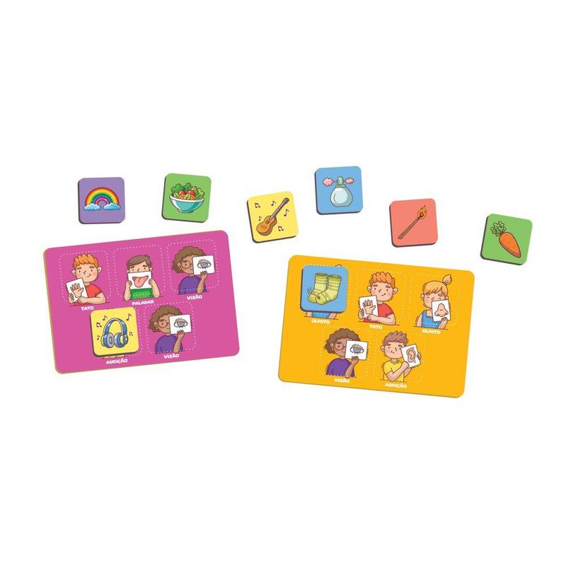 Para jogar, a criança deve sortear uma das peças em madeira e identificar qual sentido ela representa. Em seguida, deve encontrar a figura correspondente em uma das cartelas e colocar a peça no espaço adequado. O objetivo é ser o primeiro a completar todos os sentidos na sua cartela.