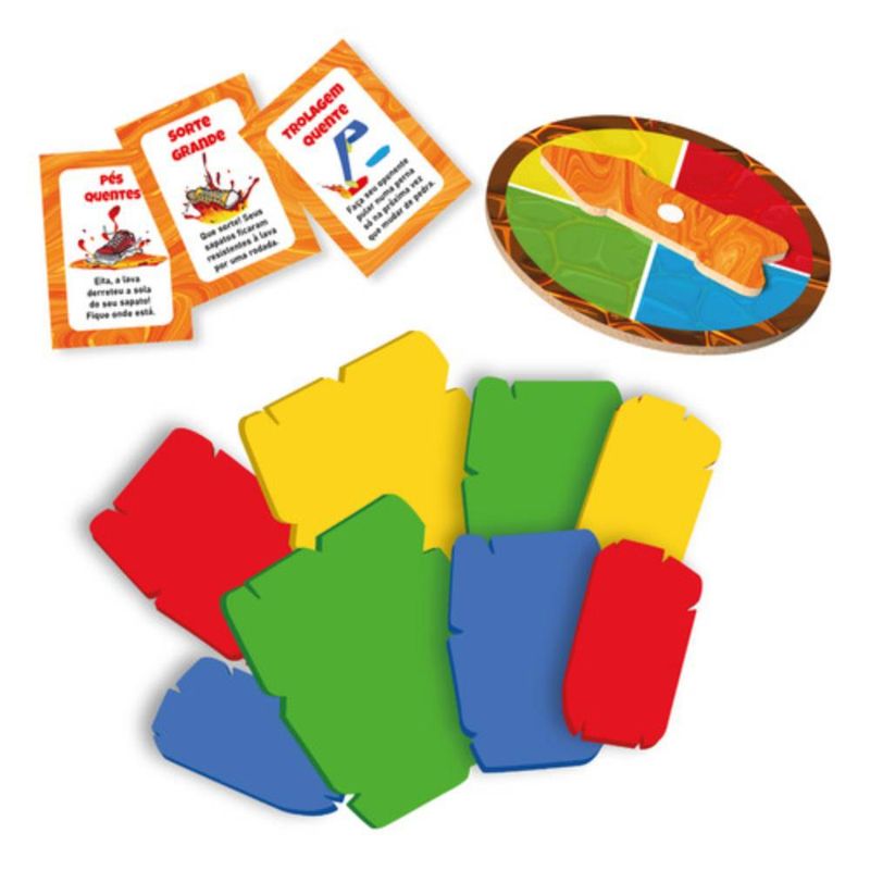 A brincadeira começa espalhando as 20 "pedras" de EVA pelo chão. Com a ajuda da roleta e das cartas, os jogadores são desafiados a pular de uma pedra para outra sem tocar o chão, que se transformou em lava! As cartas incluem desafios divertidos, tornando o jogo mais dinâmico e desafiador a cada rodada.