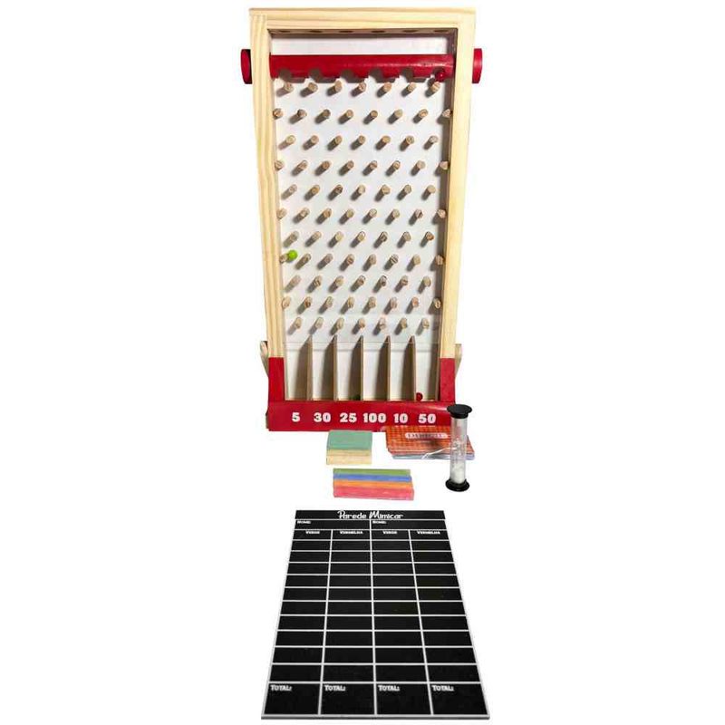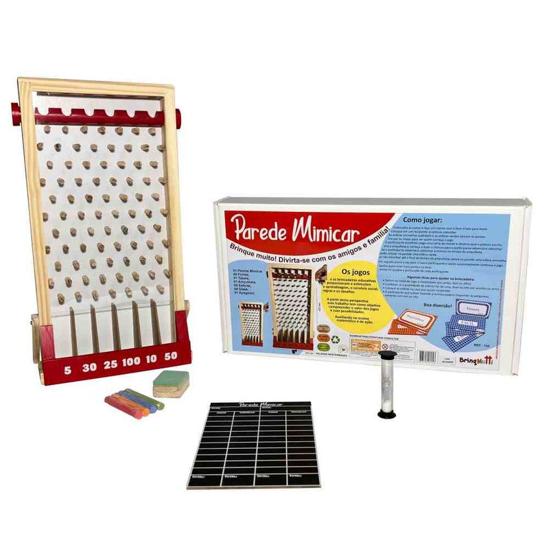 Contém: 1 parede mimicar, 60 fichas, 01 tabela, 01 ampulheta, 06 esferas, 04 gizes e 01 apagador