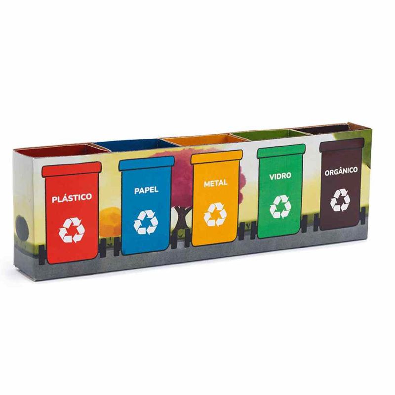 Contém: 5 peças em madeira representando os objetos do lixo ( 1 garrafa de vidro, 1 copo plástico, 1 lata de alumínio, 1 folha de papel e 1 casca de banana), 1 lixeira em papel-cartão com 5 divisórias, 45 cartas e 1 folheto com regras do jogo.