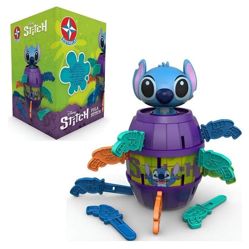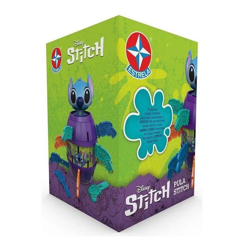 Conteúdo: 1 jogo Pula Stitch - Estrela, contendo 1 stitch, , 1 barril, 1 folha de adesivos e 24 armas laser