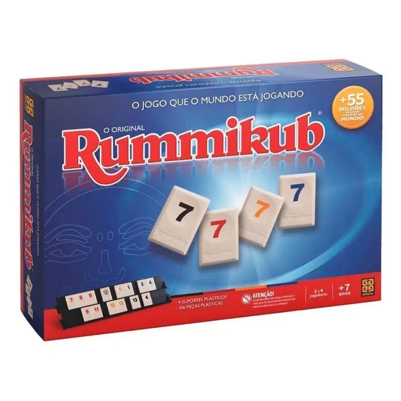 Rummikub é um dos jogos mais vendidos no mundo que a Grow trouxe para o Brasil. É jogado em vários países, possuindo inclusive um campeonato mundial, realizado de 3 em 3 anos, reunindo os campeões dos países onde o jogo é vendido. Cada participante começa o jogo com 14 pedras, e o objetivo é se livrar de todas elas, baixando jogos sobre a mesa. Os jogos podem ser sequências numéricas de mesma cor, ou de números iguais e cores diferentes. O grande diferencial é que você pode encaixar suas pedras nos jogos baixados pelos outros jogadores. Os jogos que estão na mesa oferecem uma infinidade de possibilidades para você encaixar suas pedras. Separe sequências numéricas, junte dois ou três jogos em um só e faça qualquer movimentação com as pedras que estão na mesa. Com um pouco de atenção e raciocínio, você verá que o que parece impossível pode ser viável, e jogadas surpreendentes podem acontecer.