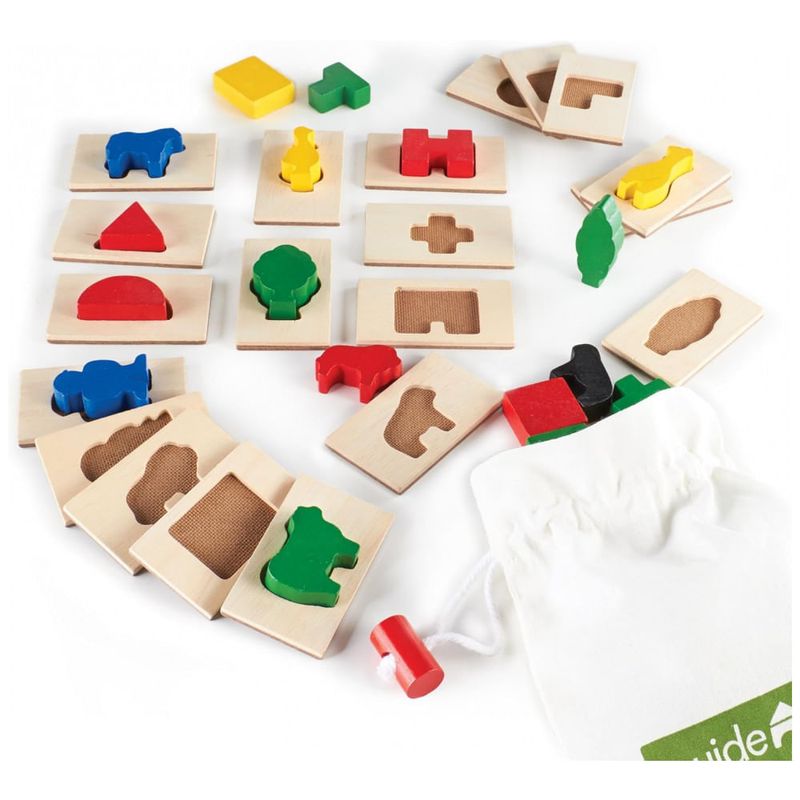 O Guidecraft 3D Feel & Find Icons é um jogo de associação tátil e visual em madeira, indicado para crianças a partir de 3 anos, que trabalha reconhecimento de formas, pareamento e memória sensorial. O conjunto propõe que a criança alcance as peças dentro da bolsa de tecido apenas pelo tato e encontre a forma que corresponde ao símbolo gravado no bloco/plaque, reforçando discriminação tátil e atenção.?