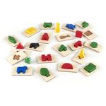 O set inclui formas geométricas e objetos em madeira espessa, com contornos bem definidos, que podem ser usados tanto como jogo de pareamento quanto como pequenos quebra-cabeças de peça única. A dinâmica permite jogos individuais ou em dupla, favorecendo desenvolvimento de vocabulário, habilidades de classificação, coordenação motora fina e exercícios de percepção visual e tátil em contexto lúdico.?