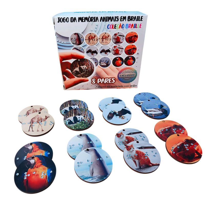 - 8 pares de peças redondas com imagens reais de animais e relevo em Braille feito com strass para fácil leitura tátil
