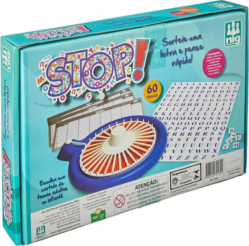 OBJETIVO DO JOGO= QUEM PREENCHE PRIMEIRO TODAS OU UM NUMERO MINIMO DE CATEGORIAS FALA STOP E TODOS OS OUTROS JOGADORES PARAM O JOGO. VENCE QUEM SOMAR MAIS PONTOS.