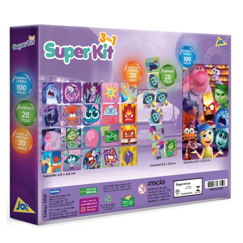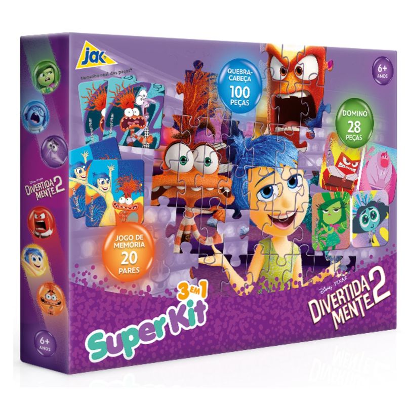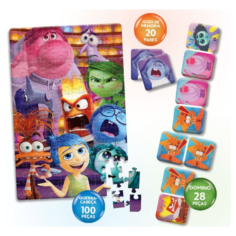 • Divirta-se com este Super Kit 3 em 1 que trás Jogo da Memória, Dominó e Quebra-Cabeças baseados no Divertidamente 2 da Disney.