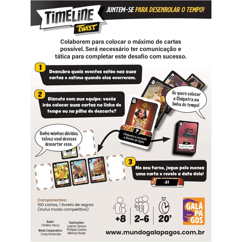 O Timeline Twist Reimagina o Jogo Timeline de Uma Forma Mais Divertida: Cada Jogo Agora É Um Desafio Cooperativo, Mas Você Não Precisa Ser Um Aficionado Por História Para Jogar! Nesta Nova Edição, Os Jogadores Formam Uma Equipe, Comunicam-Se e Coordenam-Se Para Encontrar a Melhor Estratégia Para Jogar Todas As Cartas do Jogo. o Objetivo da Equipe É Se Livrar de Todas As Cartas Que Os Jogadores Têm em Mãos, Seja Colocando o Maior Número Possível de Eventos Na Ordem Certa Nas Linhas do Tempo ou Descartando-Os com Sabedoria. Inclui Modo de Jogo Competitivo.