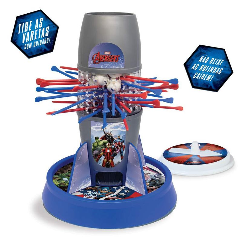 O Jogo Tira Varetas Avengers é pura diversão! Coloque as bolinhas de neve dentro da torre, gire a roleta e vá puxando as varetas. Mais cuidado, pois só o herói que deixar cair menos bolinhas, será o vencedor. Conteúdo: 1 Torre, 1 base, 1 roleta, 20 bolinhas, 24 varetas, regra e 1 folha de adesivo. Cores: Base azul escura, bolinha branca, corpo cristal, torres vermelhas e varetas azuis e amarelas.