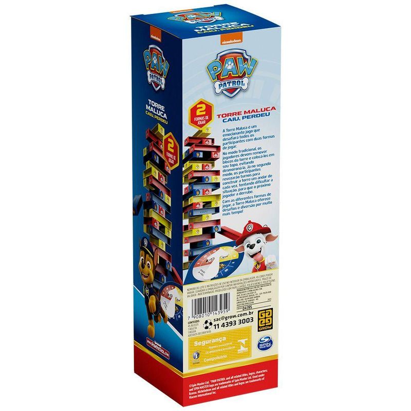 Jogo Torre Maluca Patrulha Canina - GrowA Torre Maluca é um emocionante jogo que desafiará todos os participantes com duas formas de jogar. Modo Tradicional: Os jogadores devem remover blocos da torre e colocá-los em seu topo, evitando desmoroná-la. Modo Competitivo: Os participantes revezam turnos para construir a torre um andar de cada vez, tentando dificultar a situação para que o próximo jogador a derrube. Com essas diferentes formas de jogar, a Torre Maluca oferece desafios e diversão por muito mais tempo! Idade recomendada: A partir de 5 anos; Selo Inmetro: CE-BRI/ICEPEX-N 01264-25;