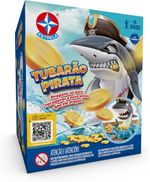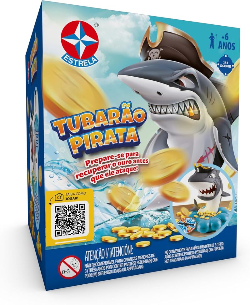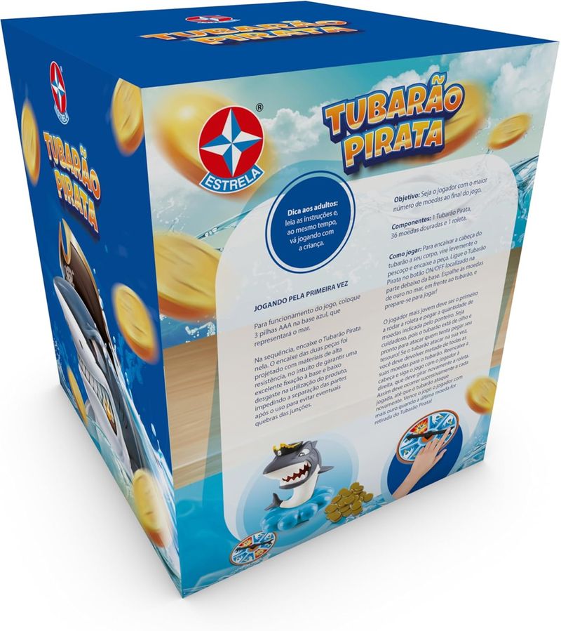 Um jogo divertido e dinâmico, mas tome cuidado com o Tubarão Pirata! Os jogadores devem?recuperar o ouro roubado pelo?tubarão, de pouco a pouco, girando a roleta que indica a quantidade de moedas que devem ser recuperadas por jogada. Se o tubarão atingir durante a sua jogada, você deve devolver metade do ouro?que tem. O jogo acaba quando todas as moedas forem recuperadas, e ganha quem tiver acumulado mais moedas. O jogo funciona com 3 pilhas AA. (não inclusas)