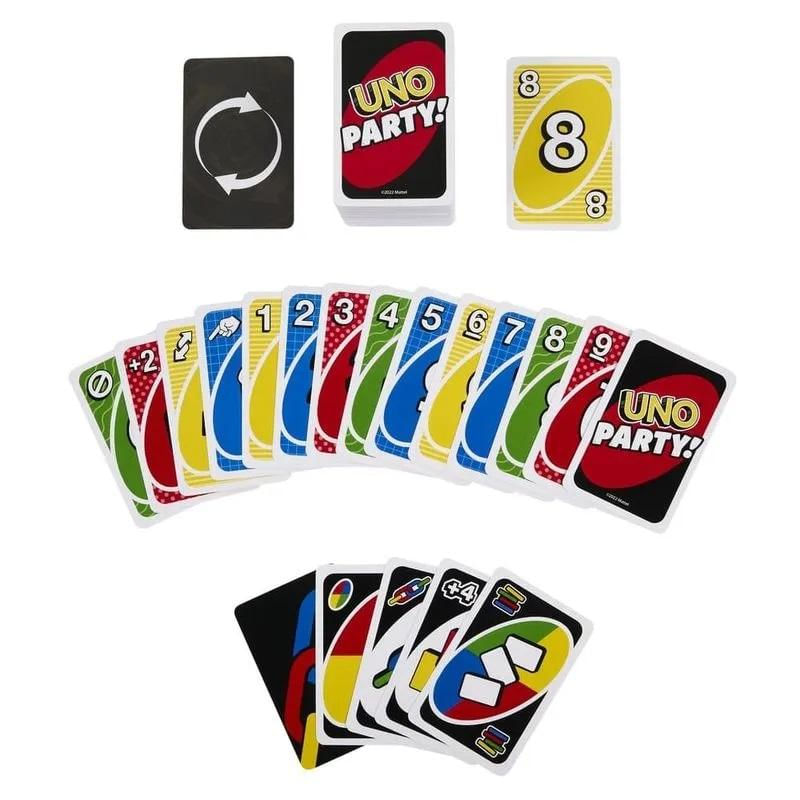 Hora de reunir todo mundo para jogar o UNO™ Party Card Game, com a jogabilidade clássica que os jogadores do UNO™ Card Game conhecem e adoram, além de cartas extras e regras especiais projetadas especificamente para grupos grandes para manter a festa em andamento! As regras desta versão farão com que os jogadores passem as cartas até que alguém não possa mais jogar, apontando para outros jogadores para comprar cartas e unindo dois jogadores que devem comprar ao mesmo tempo. Há até uma nova regra de Jogo Rápido. Projetado para 6 a 16 jogadores