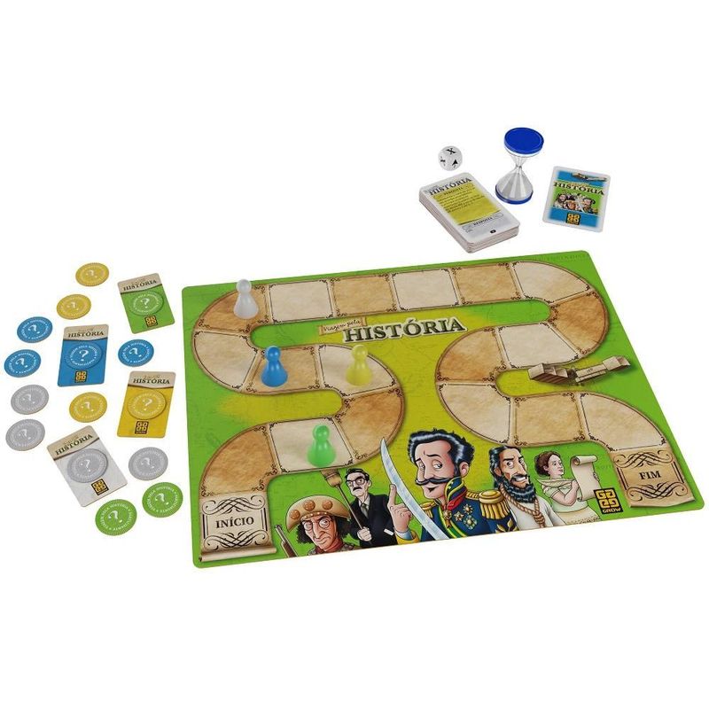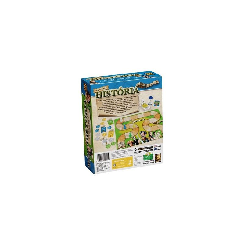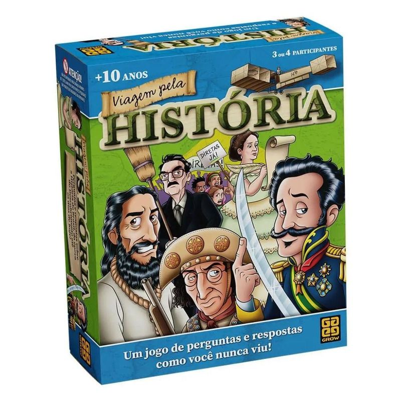Ficha Técnica:Marca: Grow;Nome do produto: Jogo Viagem Pela História;Idade recomendada: A partir de 10 anos;Selo Inmetro: CE-BRI/ICEPEX-N 01264-25 - NM300-2004 OCP 0046;Contém: 1 tabuleiro, 1 dado, 4 peões, 4 cartas de identificação, 12 fichas, 1 ampulheta, 1 baralho e 1 regra. Todos os jogadores precisarão de lápis e papel.