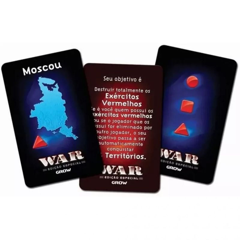 :: Conteúdo da embalagem: 1 Tabuleiro; 14 Cartas Objetivo; 42 Cartas de Território; 2 Cartas Curinga; 3 Dados Vermelhos; 3 Dados Amarelos; 6 Conjuntos de Exercitos; 6 Caixas Plásticas; 1 Manual de Regras