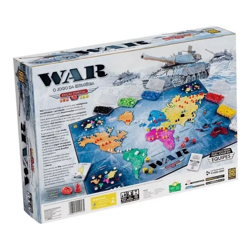 Com War, uma batalha nunca é igual a outra, e cada jogador precisa usar toda sua inteligência, astúcia e muita estratégia para derrotar seus adversários e conquistar territórios e continentes. War Edição Especial traz todo o requinte que o jogo War merece, com miniaturas de soldados e tanques representando os exércitos, tabuleiro maior e embalagem diferenciada. Confira o melhor jogo de estratégia de todos os tempos em uma versão de luxo.