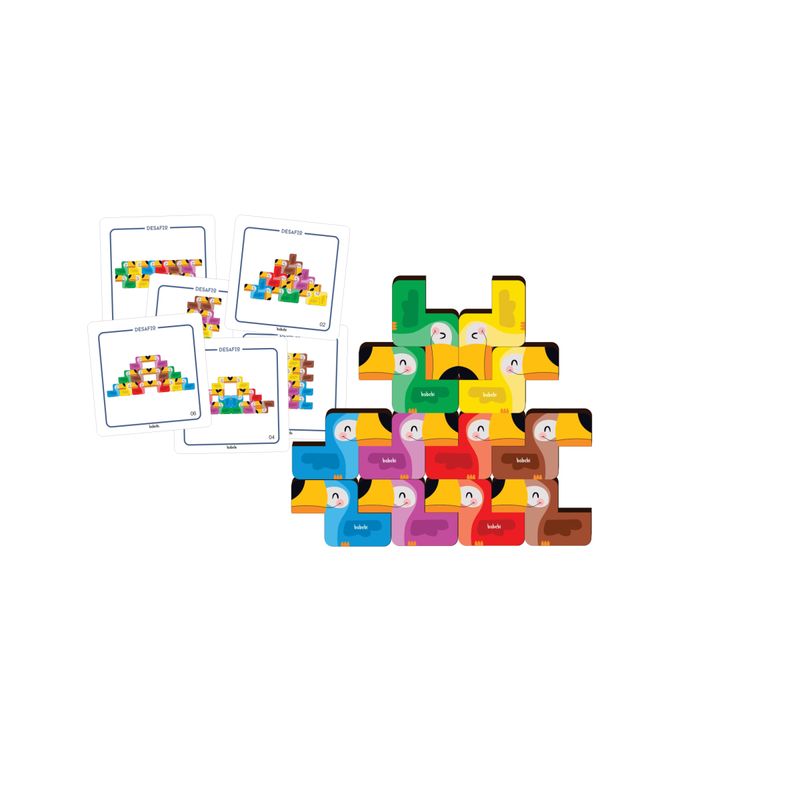Feito de Madeira Mdf Reflorestada. Contém 12 Tucanos Coloridos de Madeira e 12 Desafios. Acompanha Saco de Pano 100% Algodão.
