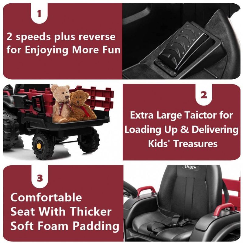 Rápido Possui grande potência. As rodas são muito onduladas, por isso percorre quase todos os terrenos. Lida com colinas muito bem. Projetado com funções de avanço e ré e duas velocidades 3 a 7 km, h para ajuste, as crianças vão adorar dirigir o trator com bateria por conta própria e obter mais entretenimento