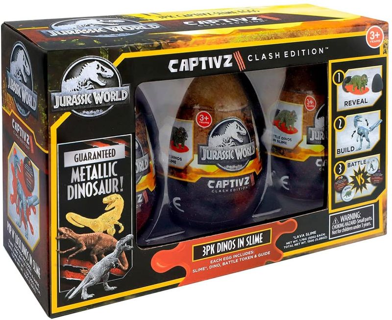 "Prepare-se para o Jurassic World definitivo: CAPTIVZ Clash Edition Season! Apresentando mais de 30 dinossauros para descobrir e criar muitas aventuras! Cada um possui marcas de ferimentos de batalha únicos e são perfeitos para recriar cenas de confronto épico como no Jurassic World! Desembrulhe seu ovo, tire a camada de slime de lava e revele sua espécie.