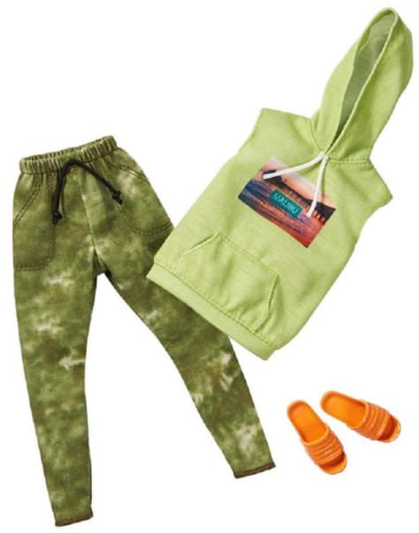 Expanda as opções de roupas e histórias para o boneco Ken com esses pacotes de moda que apresentam um visual completo: uma parte superior, uma parte inferior e um acessório. O moletom verde sem mangas tem um gráfico e combina com a calça de camuflagem. Um par de chinelos laranja dá o toque final para um look atlético completo. Misture e combine com outras roupas e acessórios para bonecos Ken para despertar a imaginação e se divertir contando histórias.